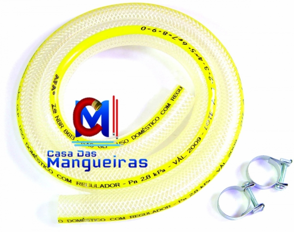 Mangueira para o botijão de gás de cozinha (GLP), vendida por metro ou tamanho pronto de 1,25 metros.