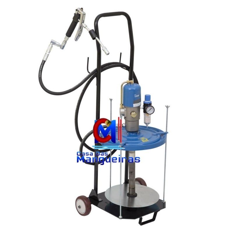 Propulsora pneumática para graxa com carrinho. Indicada para lubrificação em máquinas e equipamentos fixos que não podem ser removidos do seu local de trabalho.