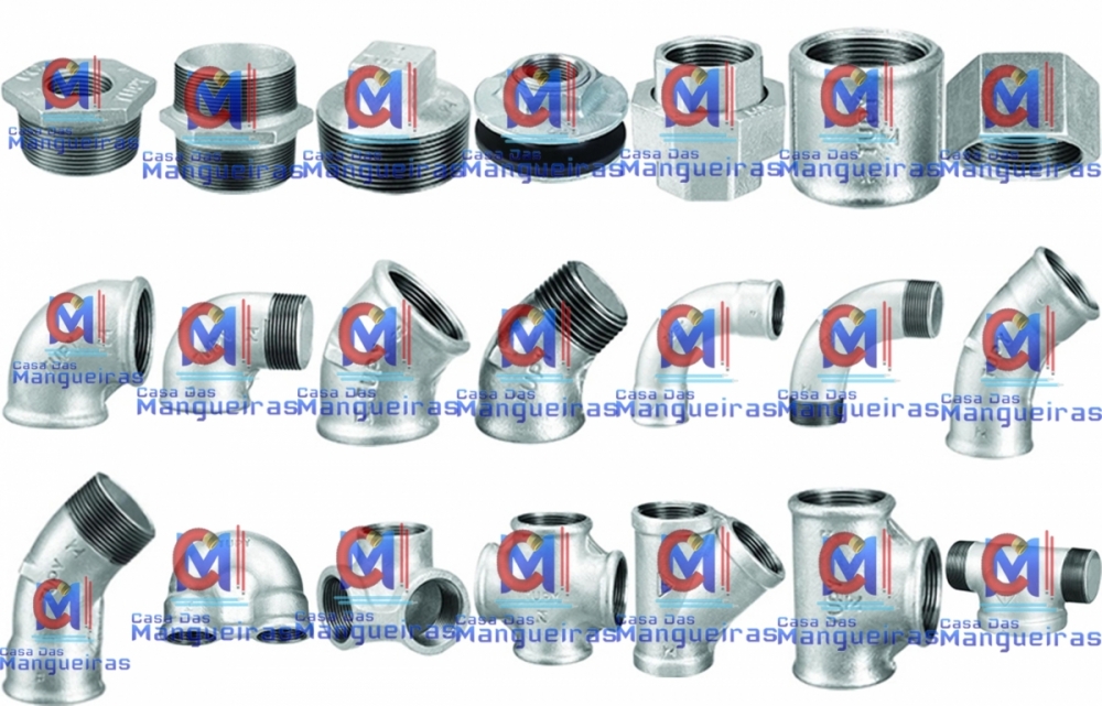 Buchas de redução, Cap (tampão rosca fêmea), Bujão (plug rosca macho), Cotovelos e Curvas fêmea/fêmea, macho/fêmea, macho/macho (45° e 90°), Cotovelo com saida lateral, Cruzetas, Luvas fêmea/fêmea, macho/fêmea e de redução, Niples e de redução, Uniões com assento cônico de bronze, Teês normais, e para hidrante, Contra porcas e Flanges em ferro galvanizado de alta qualidade.