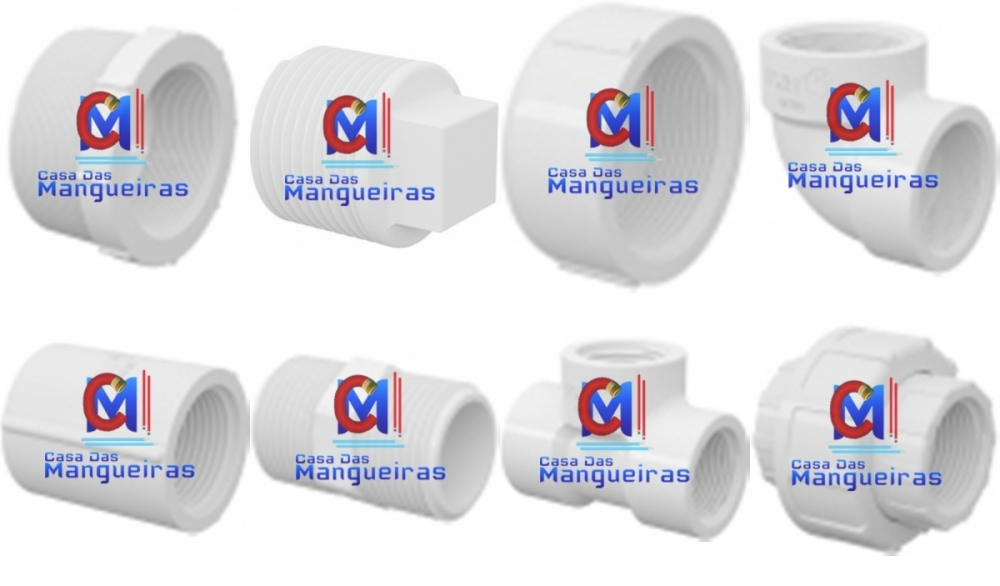 Linha de conexões em PVC com rosca. Buchas de redução, Plug (Bujões), Caps (Tampões), Cotovelos (Joelho) com e sem redução, Flanges com rosca, Luvas com e sem redução, Niples, Registros com rosca interna ou externa, Teês, Uniões. Também temos Linha Conexões PVC para mangueiras e Fitas Veda roscas.